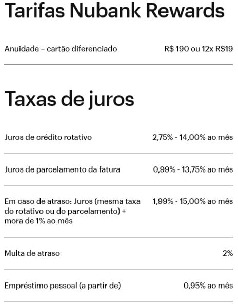 As únicas tarifas existentes no Nubank é para saque e para quem aderir ao programa de benefícios Nubank Rewards que diferentemente da maioria dos outros cartões, essa tarifa é opcional e nos possibilita oferecermos ainda mais benefícios para você otimizar a sua vida. "